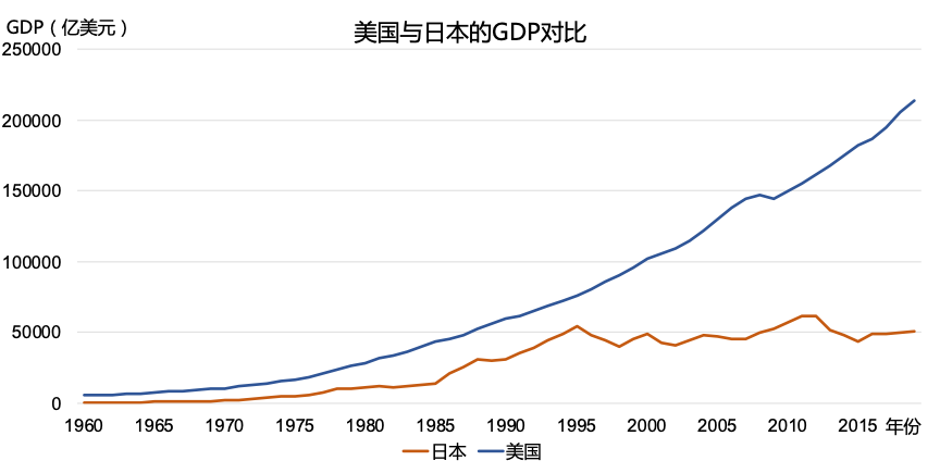 △1995年,日本的GDP还是美国的71%,人均GDP是美国的1.5倍,但到了2001年,日本的GDP就只有美国的41%了。